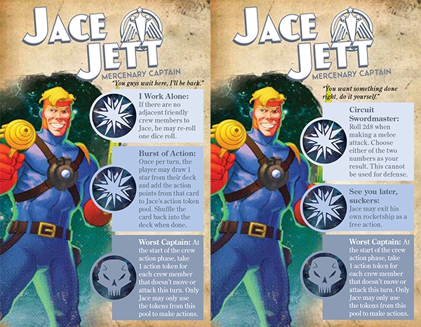 Prima Donna that he is, Jace Jett has to be different than everyone else, starting with his unique ability Not Much of a Captain. This replaces the Captain ability that most other Captains have. At the start of the crew action phase, take 1 action token for each crew member that doesn't move or attack this turn. Jace may only use the tokens from this pool to make actions. This means the less crew members who take their movement or attack actions, the more actions Jace gathers for himself. If his entire crew loafs around for three turns, a player can bank up to a whopping 18 action points! That's more than enough to run around the galaxy and back! However, Jace may only use these action tokens for himself and you've got to spend them before the round is over otherwise they go away.