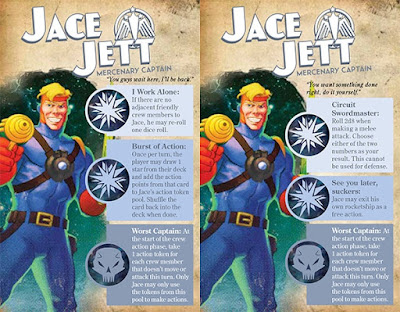 Jace's other abilities are also impressive such as Circuit Swordmaster: lets the player roll 2d8 when making a melee attack. They can choose either of the two numbers as the result. This makes Jace an extremely formidable melee attacker but this ability cannot be used for defense. Not as impressive is Used to Working Alone: If there are no adjacent friendly crew members to Jace, he may re-roll one dice roll a turn. How this guy gets hired as a Mercenary Captain, nobody knows!